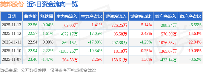 证券之星消息,截至2025年11月13日收盘,美邦股份(605033)报收于22.56元,下跌0.04%,换手率1.44%,成交量1.95万手,成交额4399.31万元。