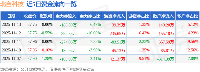 证券之星消息,截至2025年11月13日收盘,北自科技(603082)报收于37.75元,上涨0.0%,换手率1.91%,成交量7736.0手,成交额2916.46万元。