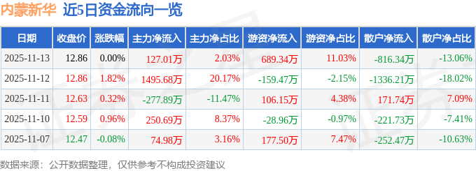 证券之星消息,截至2025年11月13日收盘,内蒙新华(603230)报收于12.86元,上涨0.0%,换手率1.38%,成交量4.87万手,成交额6251.08万元。