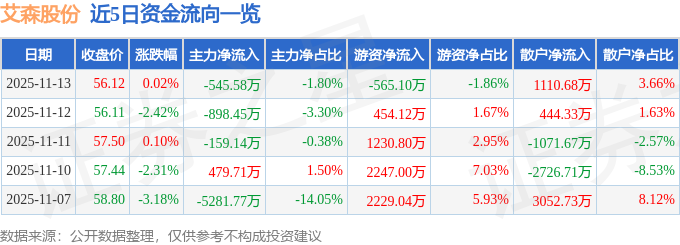 证券之星消息,截至2025年11月13日收盘,艾森股份(688720)报收于56.12元,上涨0.02%,换手率9.6%,成交量5.3万手,成交额3.04亿元。