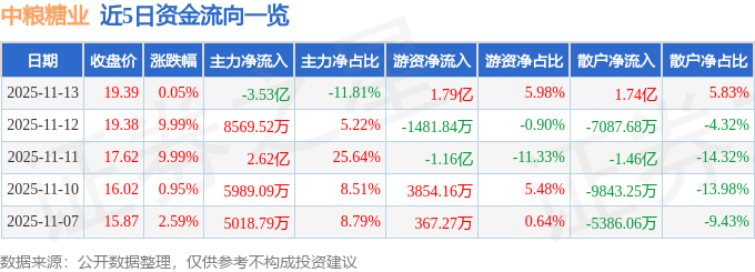 证券之星消息,截至2025年11月13日收盘,中粮糖业(600737)报收于19.39元,上涨0.05%,换手率7.11%,成交量152.09万手,成交额29.91亿元。