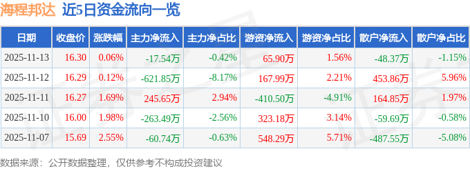证券之星消息,截至2025年11月13日收盘,海程邦达(603836)报收于16.3元,上涨0.06%,换手率1.27%,成交量2.6万手,成交额4219.89万元。