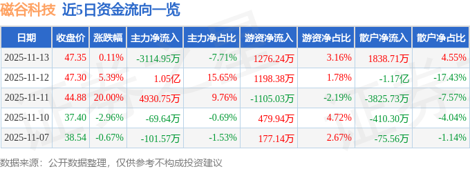 证券之星消息,截至2025年11月13日收盘,磁谷科技(688448)报收于47.35元,上涨0.11%,换手率18.06%,成交量8.66万手,成交额4.04亿元。