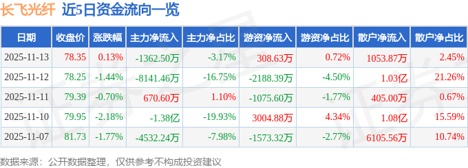 证券之星消息,截至2025年11月13日收盘,长飞光纤(601869)报收于78.35元,上涨0.13%,换手率1.35%,成交量5.5万手,成交额4.3亿元。