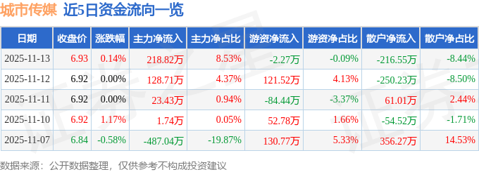 11月13日的资金流向数据方面,主力资金净流入218.82万元,占总成交额8.53%,游资资金净流出2.27万元,占总成交额0.09%,散户资金净流出216.55万元,占总成交额8.44%。