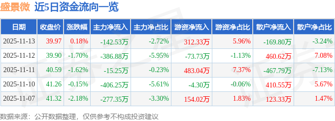证券之星消息,截至2025年11月13日收盘,盛景微(603375)报收于39.97元,上涨0.18%,换手率2.05%,成交量1.31万手,成交额5240.36万元。