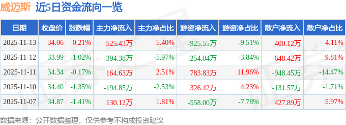 证券之星消息,截至2025年11月13日收盘,威迈斯(688612)报收于34.06元,上涨0.21%,换手率1.14%,成交量2.87万手,成交额9729.72万元。