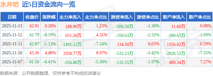 证券之星消息,截至2025年11月13日收盘,水井坊(600779)报收于42.91元,上涨0.28%,换手率0.74%,成交量3.61万手,成交额1.54亿元。