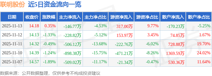 证券之星消息,截至2025年11月13日收盘,联明股份(603006)报收于14.18元,上涨0.35%,换手率0.9%,成交量2.29万手,成交额3243.26万元。