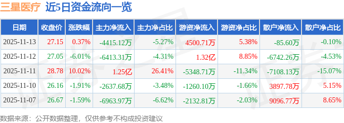 证券之星消息,截至2025年11月13日收盘,三星医疗(601567)报收于27.15元,上涨0.37%,换手率2.18%,成交量30.69万手,成交额8.37亿元。