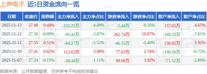 证券之星消息,截至2025年11月13日收盘,上声电子(688533)报收于27.48元,上涨0.44%,换手率0.76%,成交量1.24万手,成交额3390.5万元。