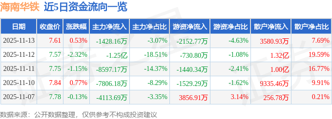 证券之星消息,截至2025年11月13日收盘,海南华铁(603300)报收于7.61元,上涨0.53%,换手率3.07%,成交量61.36万手,成交额4.65亿元。