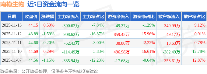 证券之星消息,截至2025年11月13日收盘,南模生物(688265)报收于44.15元,上涨0.59%,换手率1.12%,成交量8700.0手,成交额3836.84万元。