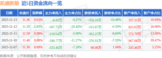 证券之星消息,截至2025年11月13日收盘,凯盛新能(600876)报收于11.36元,上涨0.62%,换手率0.74%,成交量2.94万手,成交额3345.29万元。