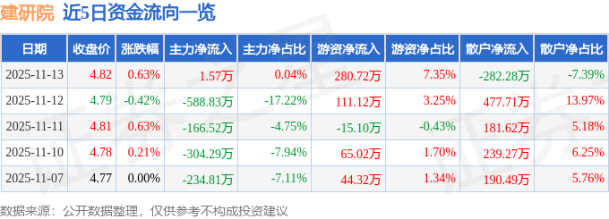 证券之星消息,截至2025年11月13日收盘,建研院(603183)报收于4.82元,上涨0.63%,换手率1.6%,成交量7.95万手,成交额3819.77万元。