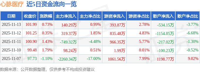 证券之星消息,截至2025年11月13日收盘,心脉医疗(688016)报收于101.99元,上涨0.73%,换手率1.13%,成交量1.39万手,成交额1.42亿元。