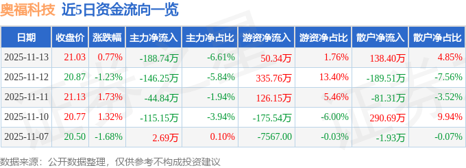 证券之星消息,截至2025年11月13日收盘,奥福科技(688021)报收于21.03元,上涨0.77%,换手率1.78%,成交量1.36万手,成交额2855.74万元。