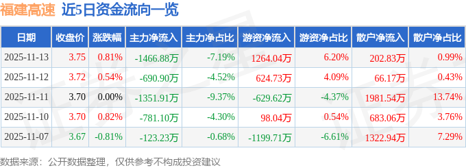 证券之星消息,截至2025年11月13日收盘,福建高速(600033)报收于3.75元,上涨0.81%,换手率1.99%,成交量54.7万手,成交额2.04亿元。