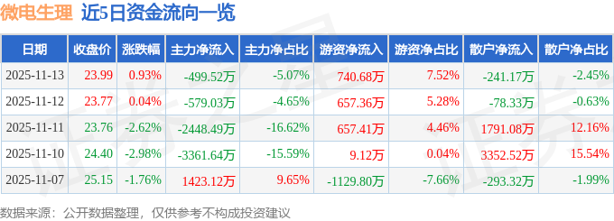 证券之星消息,截至2025年11月13日收盘,微电生理(688351)报收于23.99元,上涨0.93%,换手率3.3%,成交量4.12万手,成交额9850.96万元。