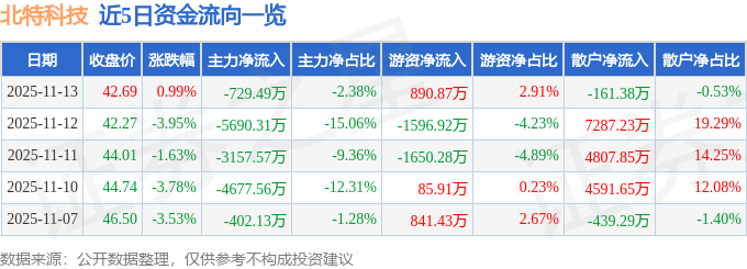 证券之星消息,截至2025年11月13日收盘,北特科技(603009)报收于42.69元,上涨0.99%,换手率2.13%,成交量7.2万手,成交额3.06亿元。