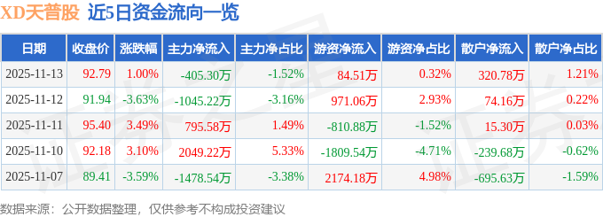 11月13日的资金流向数据方面,主力资金净流出405.3万元,占总成交额1.52%,游资资金净流入84.51万元,占总成交额0.32%,散户资金净流入320.78万元,占总成交额1.21%。