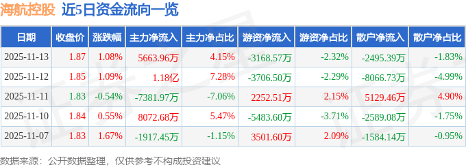 证券之星消息,截至2025年11月13日收盘,海航控股(600221)报收于1.87元,上涨1.08%,换手率2.22%,成交量728.24万手,成交额13.66亿元。