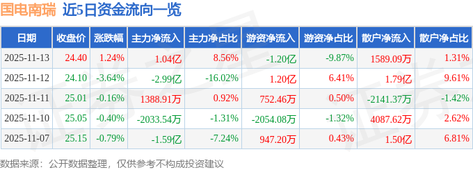 证券之星消息,截至2025年11月13日收盘,国电南瑞(600406)报收于24.4元,上涨1.24%,换手率0.63%,成交量50.12万手,成交额12.13亿元。