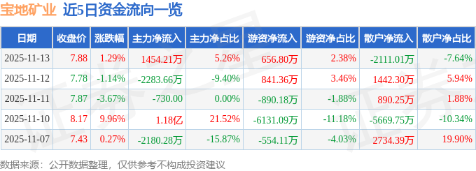 证券之星消息,截至2025年11月13日收盘,宝地矿业(601121)报收于7.88元,上涨1.29%,换手率9.18%,成交量34.89万手,成交额2.76亿元。