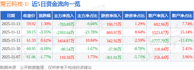 证券之星消息,截至2025年11月13日收盘,青云科技(688316)报收于59.92元,上涨1.3%,换手率2.73%,成交量1.31万手,成交额7787.73万元。