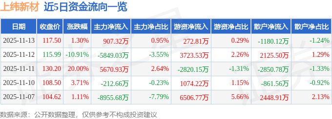 证券之星消息,截至2025年11月13日收盘,上纬新材(688585)报收于117.5元,上涨1.3%,换手率2.01%,成交量8.12万手,成交额9.5亿元。