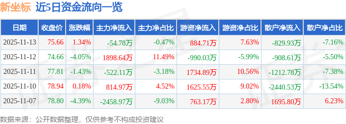 证券之星消息,截至2025年11月13日收盘,新坐标(603040)报收于75.66元,上涨1.34%,换手率1.13%,成交量1.54万手,成交额1.16亿元。