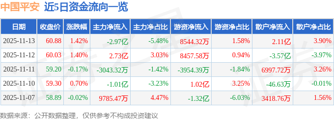 证券之星消息,截至2025年11月13日收盘,中国平安(601318)报收于60.88元,上涨1.42%,换手率0.84%,成交量89.02万手,成交额54.22亿元。