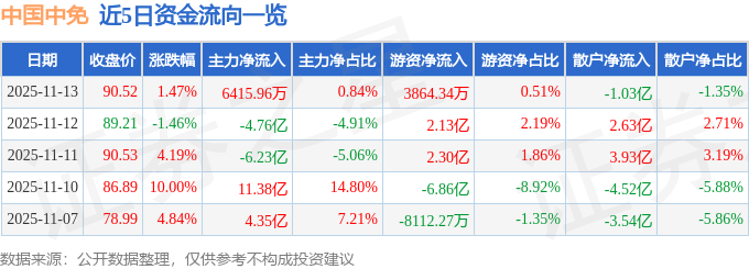 证券之星消息,截至2025年11月13日收盘,中国中免(601888)报收于90.52元,上涨1.47%,换手率4.37%,成交量85.4万手,成交额76.24亿元。