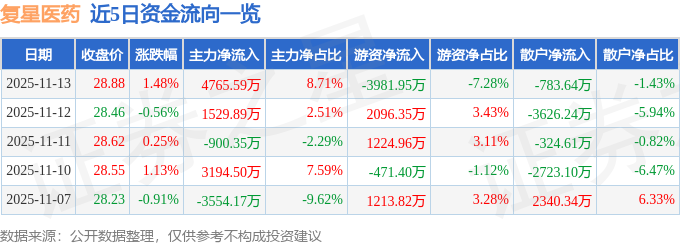 证券之星消息,截至2025年11月13日收盘,复星医药(600196)报收于28.88元,上涨1.48%,换手率0.9%,成交量19.04万手,成交额5.47亿元。