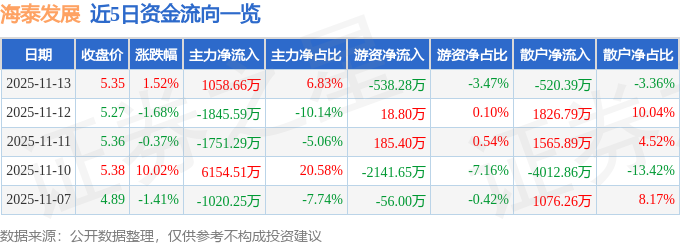 证券之星消息,截至2025年11月13日收盘,海泰发展(600082)报收于5.35元,上涨1.52%,换手率4.57%,成交量29.0万手,成交额1.55亿元。