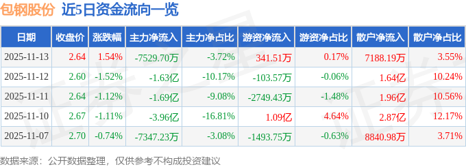 证券之星消息,截至2025年11月13日收盘,包钢股份(600010)报收于2.64元,上涨1.54%,换手率2.45%,成交量769.41万手,成交额20.23亿元。