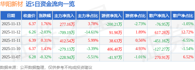 证券之星消息,截至2025年11月13日收盘,华阳新材(600281)报收于6.37元,上涨1.76%,换手率2.24%,成交量11.53万手,成交额7324.37万元。