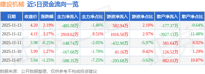 证券之星消息,截至2025年11月13日收盘,建设机械(600984)报收于4.2元,上涨2.19%,换手率5.32%,成交量66.84万手,成交额2.78亿元。
