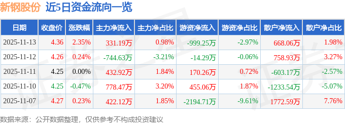证券之星消息,截至2025年11月13日收盘,新钢股份(600782)报收于4.36元,上涨2.35%,换手率2.49%,成交量78.25万手,成交额3.37亿元。
