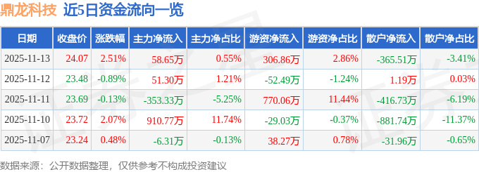 证券之星消息,截至2025年11月13日收盘,鼎龙科技(603004)报收于24.07元,上涨2.51%,换手率7.6%,成交量4.48万手,成交额1.07亿元。