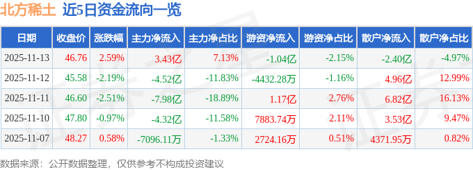 证券之星消息,截至2025年11月13日收盘,北方稀土(600111)报收于46.76元,上涨2.59%,换手率2.86%,成交量103.52万手,成交额48.2亿元。