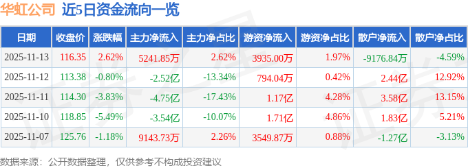 证券之星消息,截至2025年11月13日收盘,华虹公司(688347)报收于116.35元,上涨2.62%,换手率4.26%,成交量17.37万手,成交额20.01亿元。