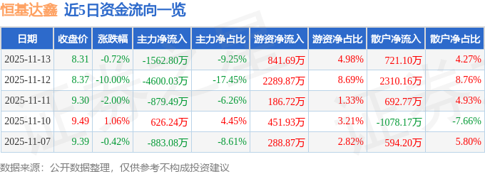 证券之星消息,截至2025年11月13日收盘,恒基达鑫(002492)报收于8.31元,下跌0.72%,换手率5.11%,成交量20.34万手,成交额1.69亿元。