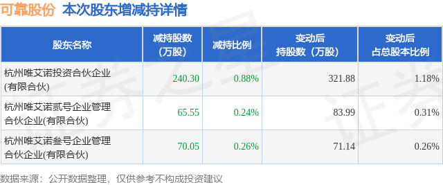 证券之星消息,11月13日可靠股份发布公告《可靠股份:关于特定股东减持股份进展暨权益变动触及1%的公告》,其股东杭州唯艾诺投资合伙企业(有限合伙)、杭州唯艾诺贰号企业管理合伙企业(有限合伙)、杭州唯艾诺叁号企业管理合伙企业(有限合伙)于2025年9月16日至2025年11月12日间合计减持375.9万股,占公司目前总股本的1.3827%,变动期间该股股价上涨7.63%,截止11月12日收盘报14.82元。