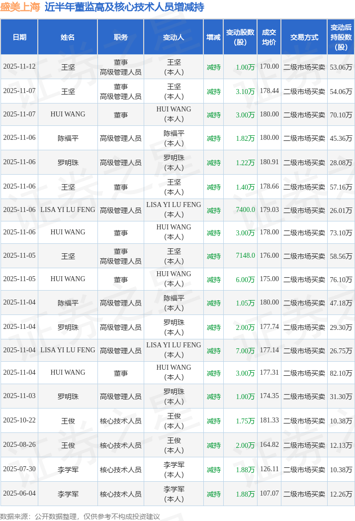 盛美上海近半年内的董监高及核心技术人员增减持详情如下: