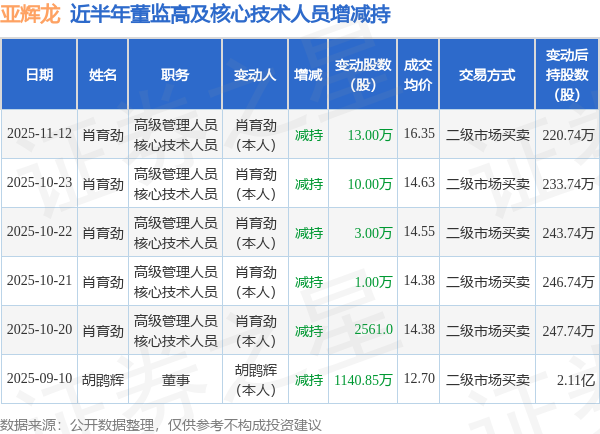 亚辉龙近半年内的董监高及核心技术人员增减持详情如下: