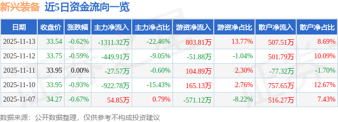 证券之星消息,截至2025年11月13日收盘,新兴装备(002933)报收于33.54元,下跌0.62%,换手率1.53%,成交量1.74万手,成交额5837.4万元。