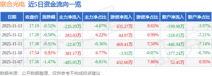 证券之星消息,截至2025年11月13日收盘,联合光电(300691)报收于17.19元,下跌0.52%,换手率1.33%,成交量2.93万手,成交额5033.36万元。