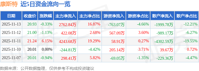 证券之星消息,截至2025年11月13日收盘,康斯特(300445)报收于20.93元,下跌0.33%,换手率5.51%,成交量7.83万手,成交额1.64亿元。