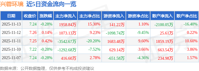 证券之星消息,截至2025年11月13日收盘,兴蓉环境(000598)报收于7.24元,下跌0.28%,换手率0.59%,成交量17.72万手,成交额1.28亿元。